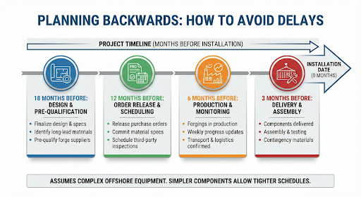 This timeline assumes complex offshore equipment like manifolds, swivel stacks, or subsea connectors. Simpler components allow tighter schedules.