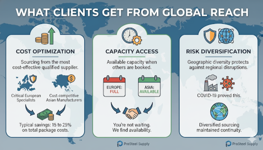 When European forges are fully booked, we have Asian capacity available. When Asian logistics create timeline risks, we have European alternatives.